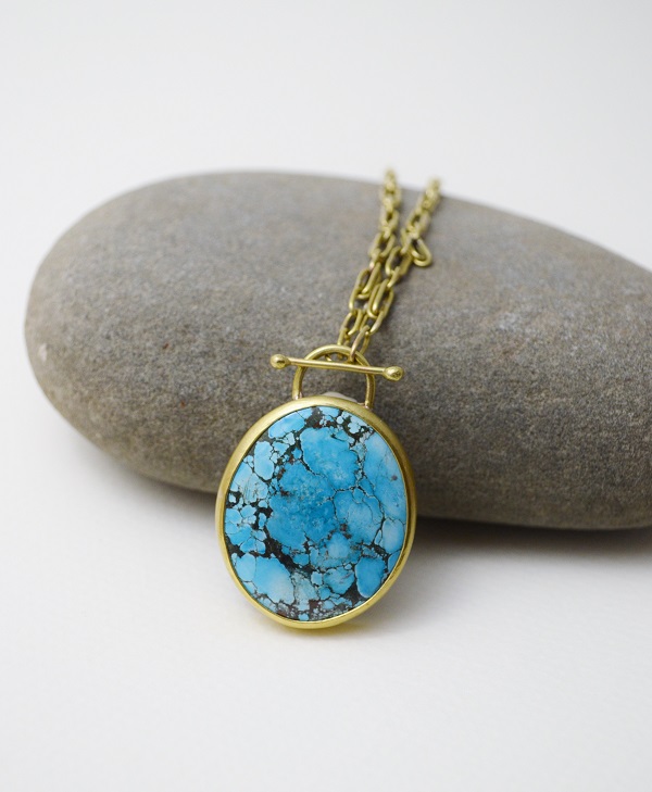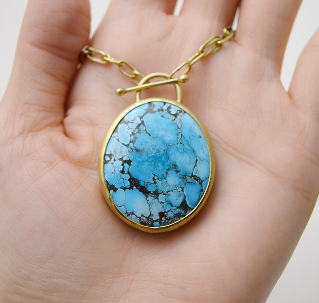 這是一顆蠻大的綠松石, 雖然不確定有沒有染色, 但至少顏色看起來很自然, 很美的藍色漸層斑塊, 這樣的分佈比例深得我心, 看起來賞心悅目, 搭配黃銅實在是再適合不過。