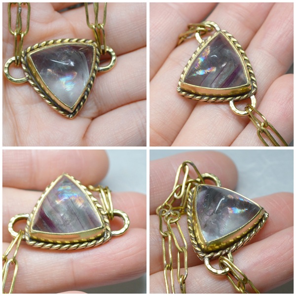 – 黃銅墜 Brass Pendant, 彩虹光暈多色螢石 rainbow muticolor Fluorite, 黃銅鍊 Brass Chain