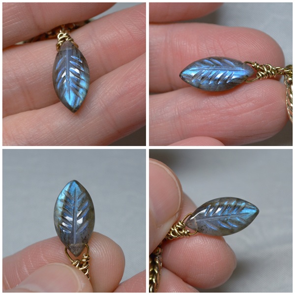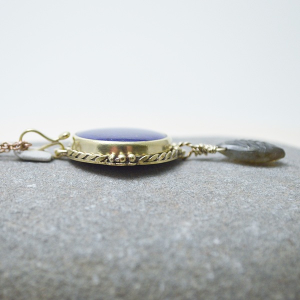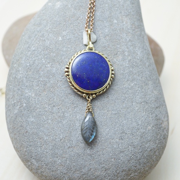 – 黃銅 Brass, 黃銅鍊 Brass Chain, 青金石 Lapis Lazuli, 拉長石葉子雕刻 Labradorite varving leaf, 拉長石珠 Labradorite Beads