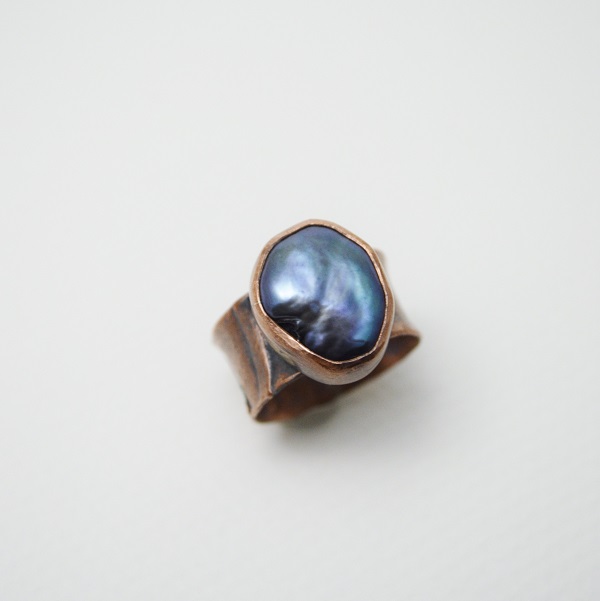 折疊系列-19號之三‧深藍綠色巴洛克珍珠‧硫化紅銅寬版戒 fold no.19-1‧Dark Green Blue Baroque Pearl‧Oxidized Wide Copper Ring